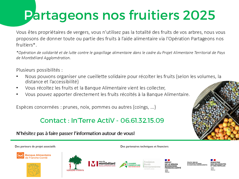 Dans le cadre de l’opération « Partageons nos fruitiers », portée par le Projet Alimentaire Territorial de Pays de Montbéliard Agglomération, nous vous